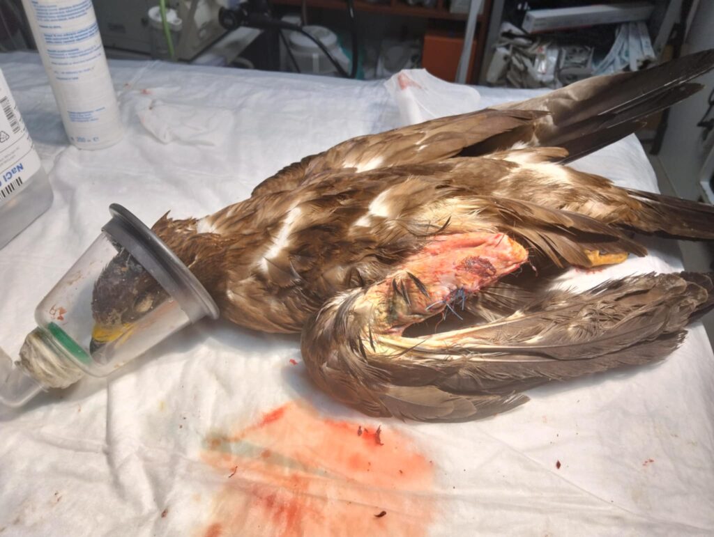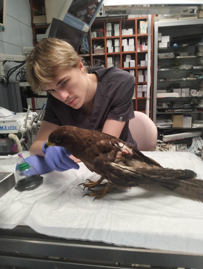 Trzmielojad niezwłocznie trafił do ośrodka. Na miejscu okazało się, że jego stan jest bardzo poważny. Był osłabiony, nie chciał jeść, a jego skrzydło dosłownie zjadały larwy much. Otwarte złamanie kości przedramienia i promieniowej, a do tego muszyca i początkowa martwica tkanek – z tym musieli sobie poradzić pracownicy ośrodka. – Ranę należało oczyścić, usunąć część piór i zmartwiałą część tkanek. Samo usunięcie larw trwało 1,5 h. Ptak otrzymał też antybiotyk. Po około 3 dniach pracy z opatrunkami i maścią regeneracyjną, wreszcie można było złożyć skrzydło i zszyć ranę – opowiada Michał Kudawski z Ośrodka w Wielgowie.